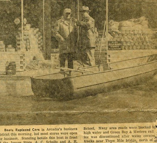 Arcadia Flood 1956 A C Schultz and A H Gauger in front of the Jensen Store 4.4.1956