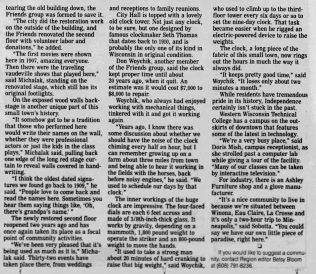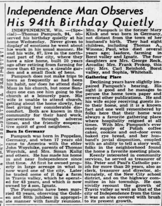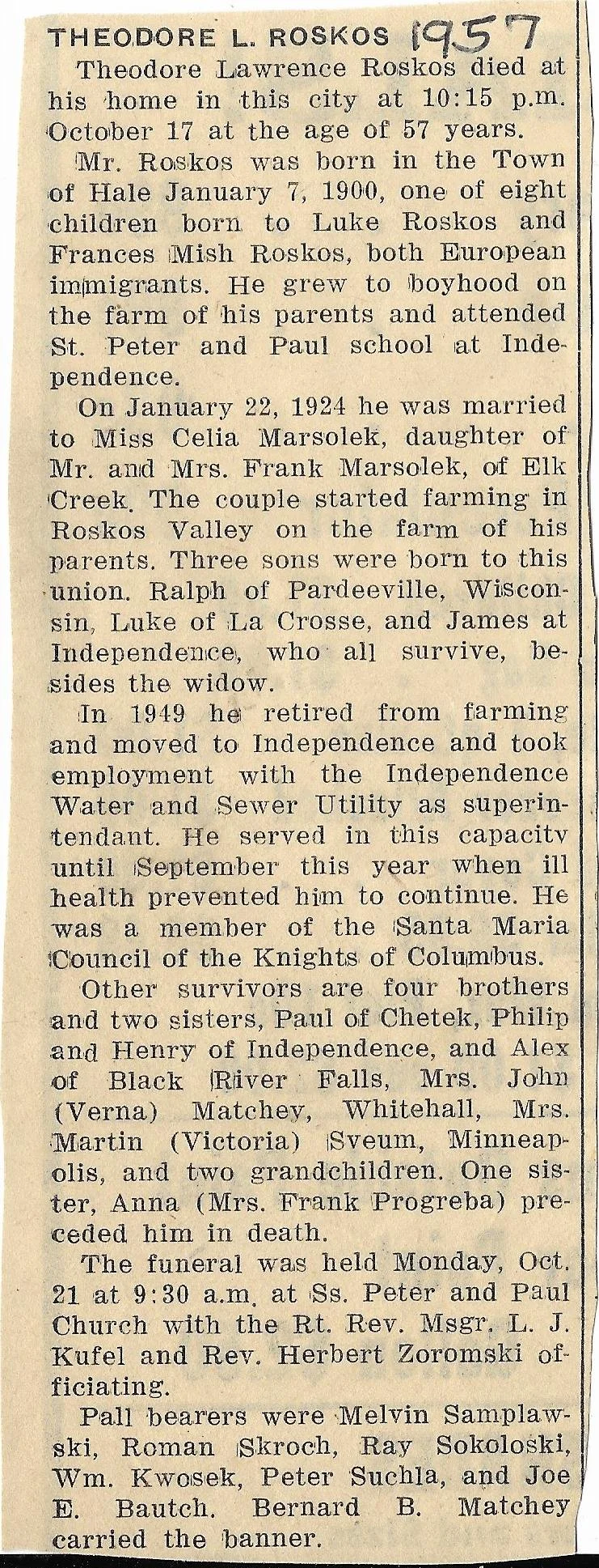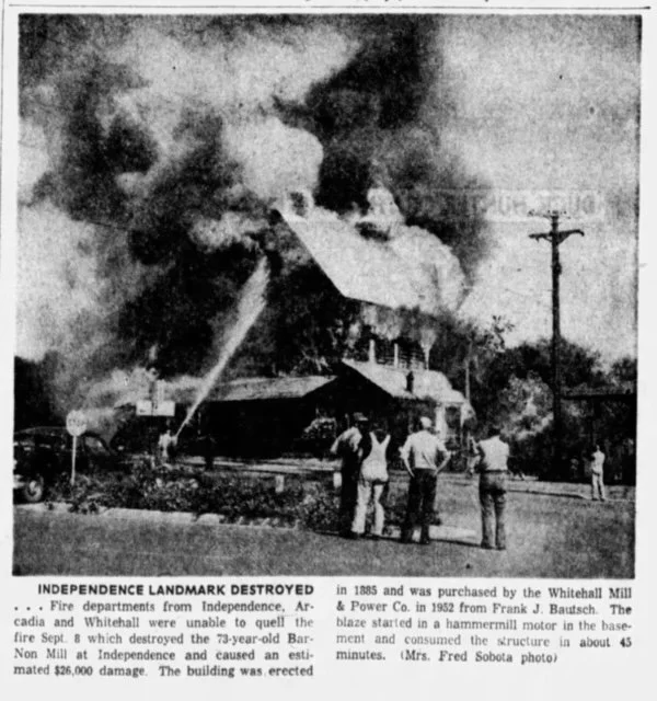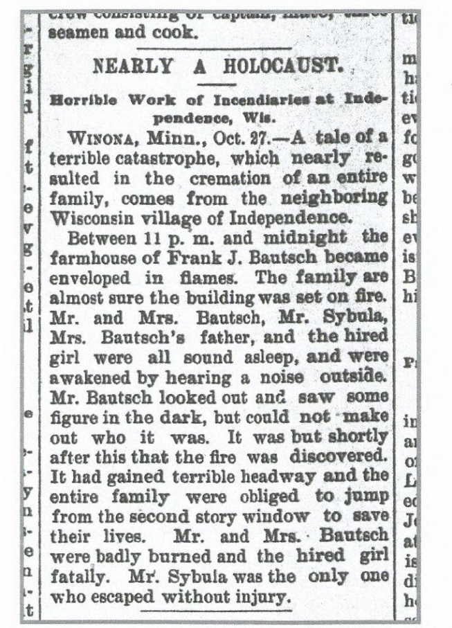 A terrible catastrophe, which nearly resulted in the cremation of an entire family, comes from our neighboring village of Independence. Shortly before midnight on Sunday, the farm home of Frank Bautsch became enveloped in flames, spreading so rapidly that the family was forced to leap from the second floor to safety. Mr. and Mrs. Bautsch were burned badly, their hired girl fatally, and only Mrs. Bautsch’s father, Mr. Sygula, escaped with injury. Shortly before the fire started, a noise was heard and Mr. Bautsch saw someone outside the house, but could not make out who it was. After the fire was extinguished, a five-gallon can of oil was found to have been emptied into the house. Thus is seems there was a most dastardly attempt to cremate a whole family. Every effort will be used to find the fiend.