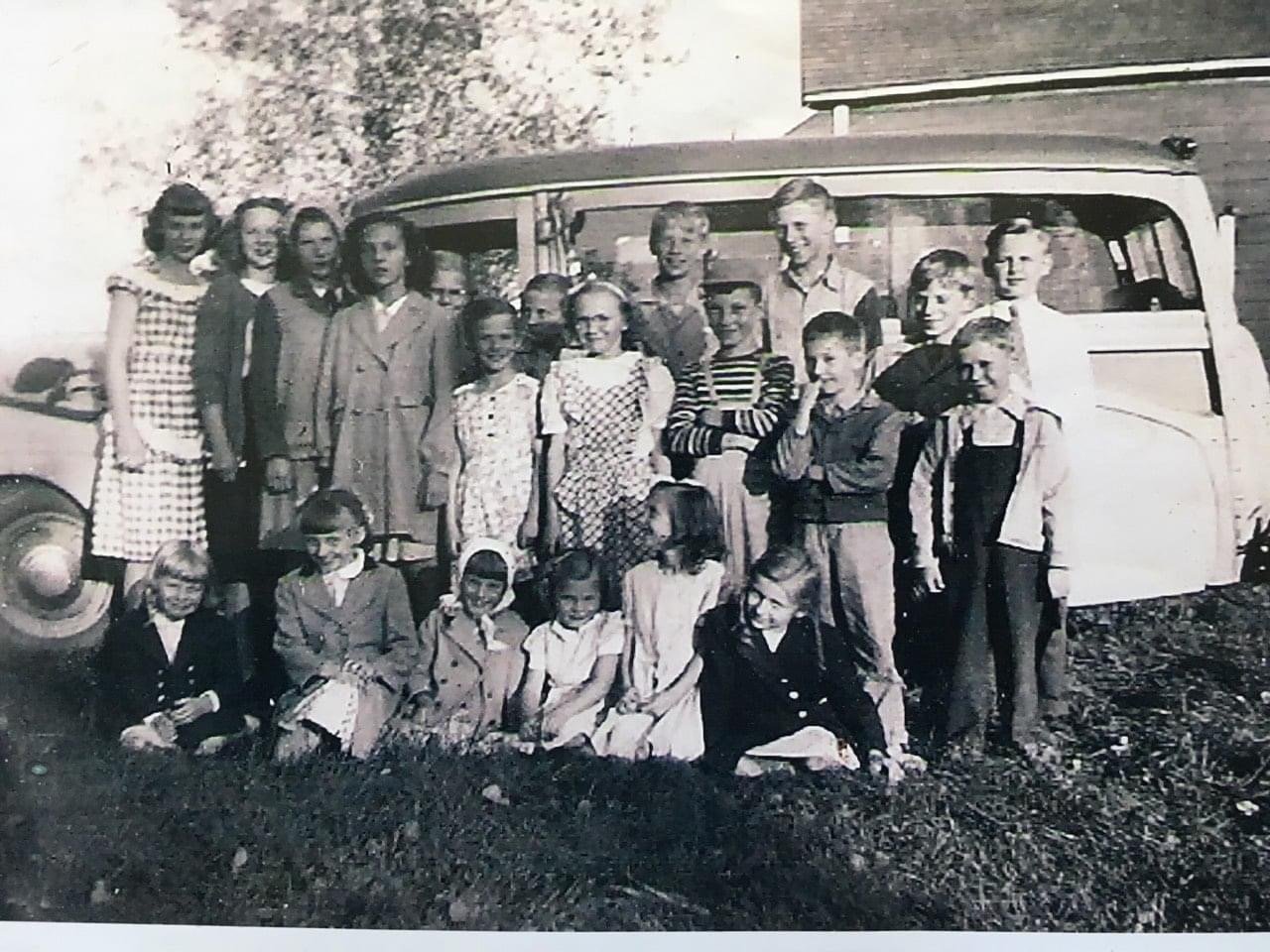 Wickham Valley School kids in front of the school and Pete Pason’s “bus” Back L-r R Marion Woychik, Berniece Sonsalla, Delores Wozney, Helen Bautch John and Ernest Sonsalla, _____, Laverne Sura Middle-Beatrice Sonsalla, ____Woychik, ____, Jim Wozney, ____Woychik Front- Bernadine Kampa, Joan Bautch, ____Wozney, Rosaline Puchalla, _____, Grace Kampa Photo Vitus Kampa