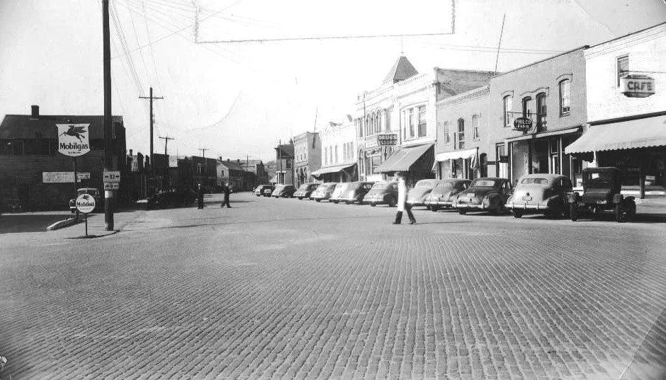1956 L-R Hardware Store, Lyga’s Store, Fank, Platz Drug, Dress shop?, Runkel’s Hardware, Andre Grocery