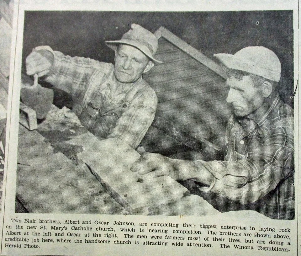 Albert and Oscar Johnson doing masonry work on new Catholic church in Galesville 1955