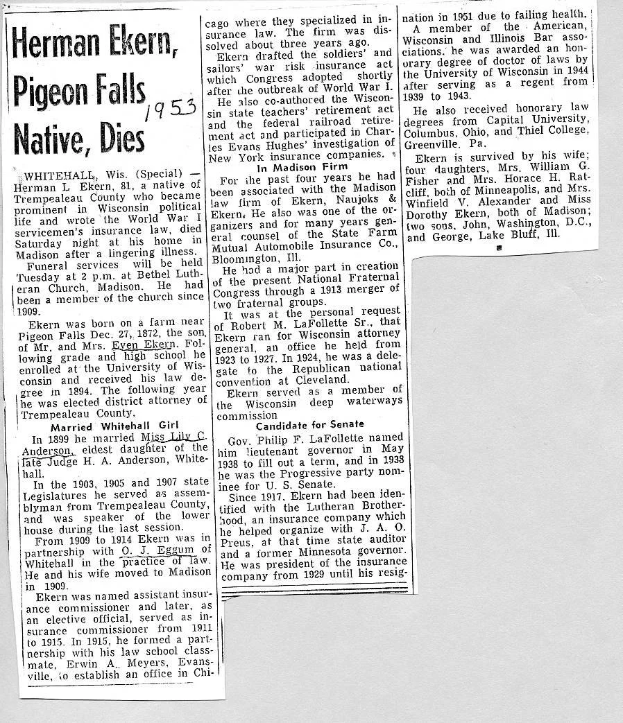 1953 Herman Ekern, pioneer businessman of Pigeon Falls