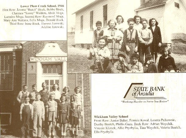 Farmers School 1945 L-R-H. Bautch, Patricia Gierok, __Marsolek, Adolph Lyga, Joe Mycek, Adeline Bautch, Clarence Matchey, M Misch, Jeanette Killian, Darlene Sluga, Paul K___ Teacher Mary Jelen (Elstad)